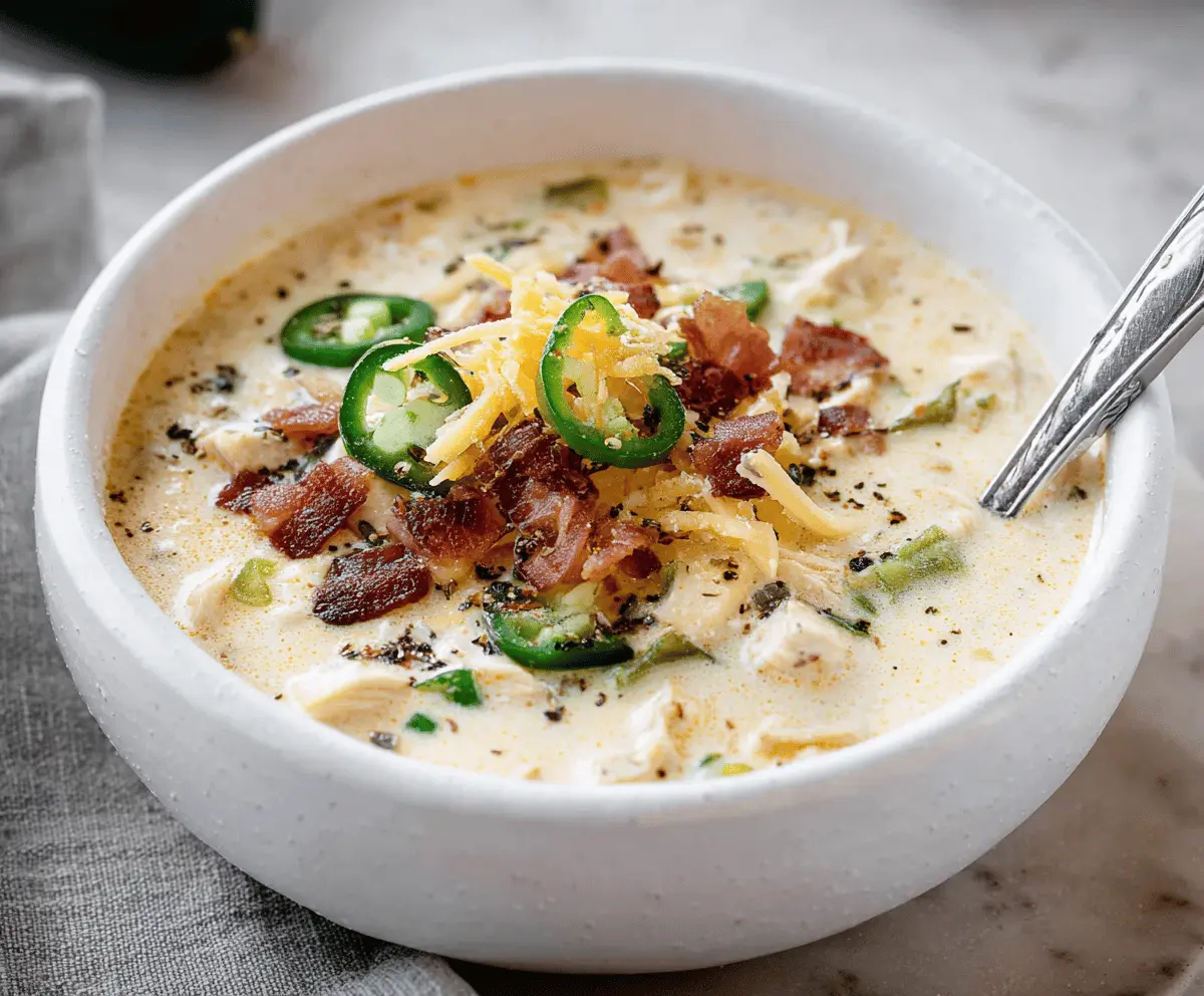 Creamy Jalapeño Popper Chicken Soup topped with melted cheese, crispy bacon, and fresh herbs, showcasing a spicy and cheesy comfort food dish.