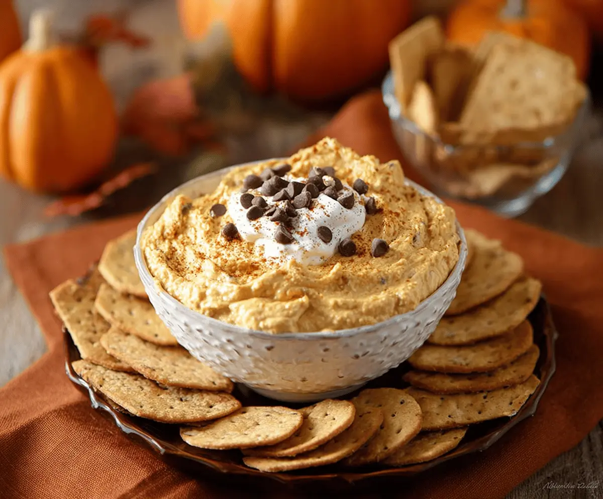 When ready to serve, top the dip with a dollop of whipped cream. Sprinkle mini chocolate chips and a little extra pumpkin pie spice on top for decoration. Serve the dip with round crispy crackers or wafers, and watch it disappear!